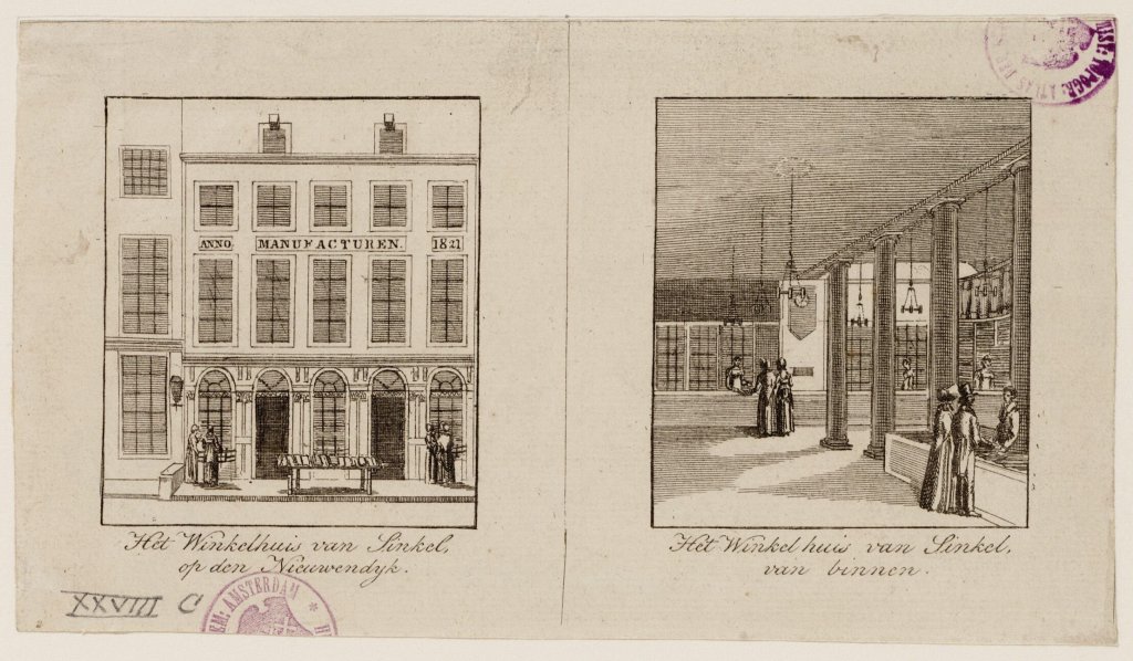 Anton Sinkel was één van de eersten, maar dus niet dé eerste, die daarmee brak. Hij nam eind 1816 de manufacturenzaak waar hij werkte over: Simon & Comp aan de Amsterdamse Nieuwendijk. Dat wordt de bekende ‘Winkel van Sinkel’. Sinkel heeft grootse plannen met de zaak, te beginnen met een verbouwing. Wanneer de zaak in juli 1818 weer opengaat, kondigt Sinkel aan dat alles voortaan voor ‘extra lage’ en ‘gezette prijzen’ verkocht wordt. Vaste prijzen dus.