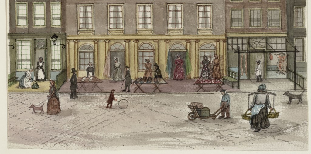 Nu had Goslin in deze situatie een kraam, geen winkel, en deed hij dingen in de uitverkoop. Het is goed denkbaar dat er in beide situaties eerder met vaste prijzen gewerkt werd dan in winkels. In vroege advertenties zie je vaste prijzen vaker bij reizende handelaren en tijdens uitverkopen terugkomen. Ook bij andere stoffenwinkels is te zien dat zij normaal gesproken niet met vaste prijzen adverteerden, maar voor zo’n tijdelijke verkoop in de provincie wel. Toch waren er ook al winkels bij wie dit al wel hun businessmodel was. Zoals een zekere De Bruyn, die in 1812 de Warmoesstraat een ‘Magazyn van gezetten prys’ had.